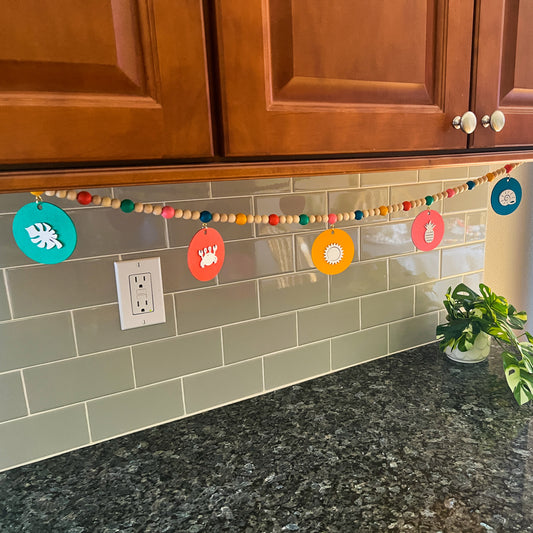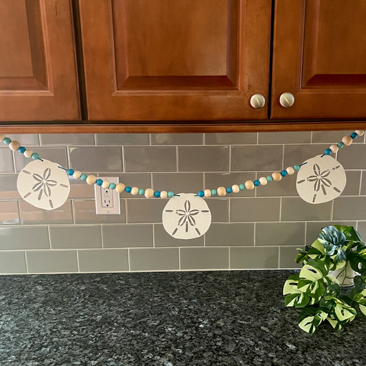 Three flat wood circles feature two different shells and a starfish. Ornaments hang from a 4.5" white ribbon and are strung with a white geometric bead and two natural wood beads.