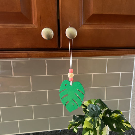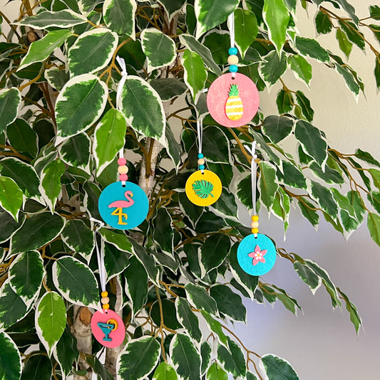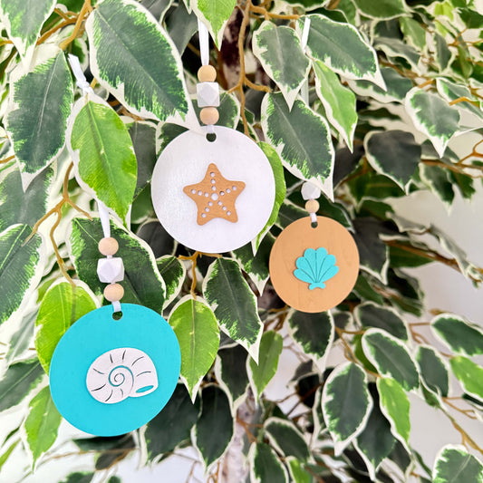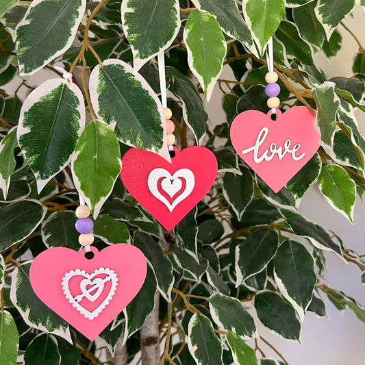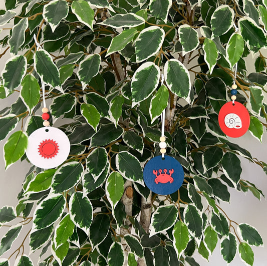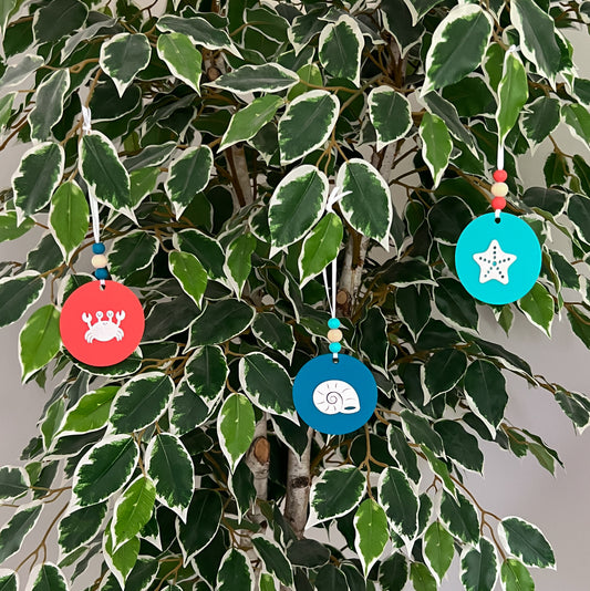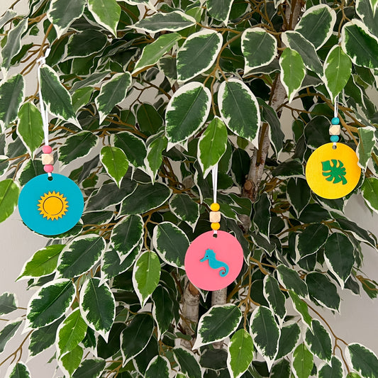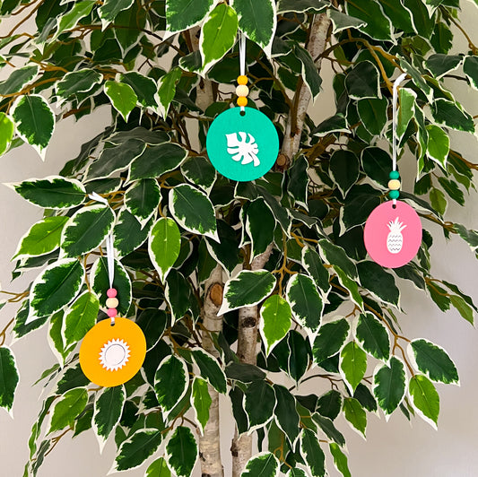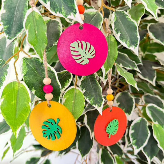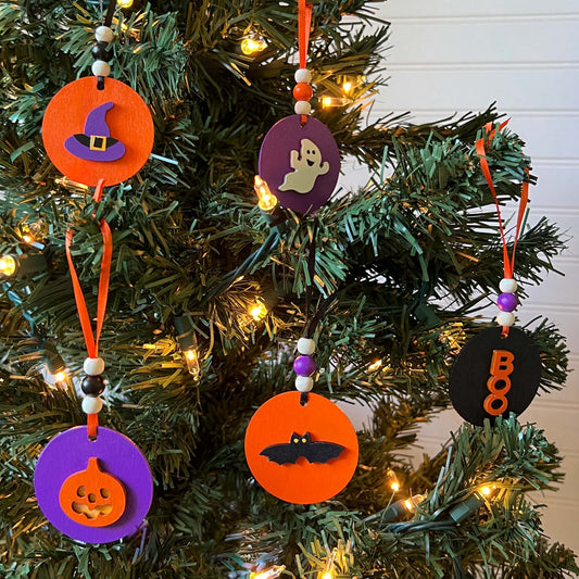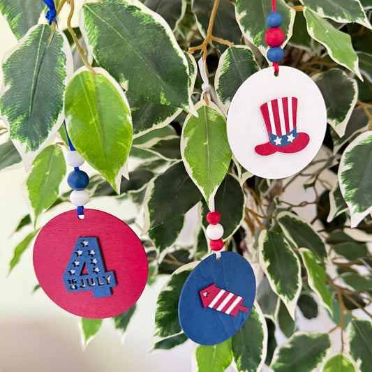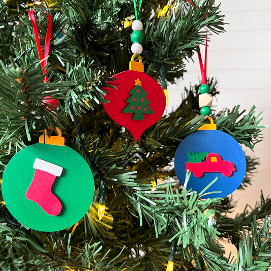 The front of each ornament features a holiday themed wood shape: a snowman, a candy cane, or a truck bringing home the tree. Ornaments hang from a matching ribbon which includes three wood beads.